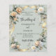 Un arrière - plan vert sage. Décoré de fleurs blanches et jaunes et d'un ruban doré. Personnalisez et ajoutez vos noms et détails. 1 feuille = 1 invite imprimé bord à bord.