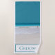 Serviette de plage à thème de Groom avec photo d'une plage de sable blanc et d'eau turquoise. Le texte, en bas de la serviette lit Groom, et peut être personnalisé pour lire ce que vous voulez. Parfait pour le mariage à la plage et la lune de miel. Disponible également pour la mariée.