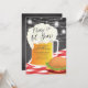 Salutations à 60 ans invitation barbecue avec une tasse de bière et burger ensemble sur un arrière - plan populaire de tableau noir avec lumières de mâcher suspendues