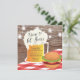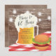 Salutations à 60 ans invitation barbecue avec une tasse à bière & burger sur un arrière - plan en bois rustique avec des lumières de mât suspendues