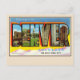 Cette reproduction de carte postale vintage présente de grandes lettres remplies d'images emblématiques de Denver Colorado.