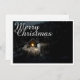 La carte montre une scène hivernale d'ambiance avec une petite cabane en bois éclairée au milieu d'une forêt enneigée. La source de lumière chaude à l'intérieur crée un beau contraste avec l'environnement sombre et paisible. L'élégante lettrage "Joyeux Noël" en blanc donne au motif une touche festive. 🎄 ✨