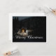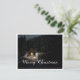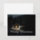La carte montre une scène hivernale d'ambiance avec une petite cabane en bois éclairée au milieu d'une forêt enneigée. La source de lumière chaude à l'intérieur crée un beau contraste avec l'environnement sombre et paisible. L'élégante lettrage "Joyeux Noël" en blanc donne au motif une touche festive. 🎄 ✨