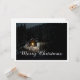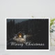La carte montre une scène hivernale d'ambiance avec une petite cabane en bois éclairée au milieu d'une forêt enneigée. La source de lumière chaude à l'intérieur crée un beau contraste avec l'environnement sombre et paisible. L'élégante lettrage "Joyeux Noël" en blanc donne au motif une touche festive. 🎄 ✨