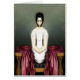 Une fille déplaisante avec les cheveux foncés courts, les grands, avec des erreurs yeux et aucune bouche, ses bras apparaissant en tant que sa camisole de force. Se reposant dans une salle verte à un sanatorium, une couverture rouge de satin est drapée autour de son torse sans jambes. Art numérique original par Taylor Addams.