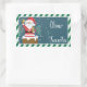 Cute kid blue and green gift tag sticker featuring a watercolor illustration of Santa Claus getting ready to go down the chimney with a bell in one hand and gifts in the other . Personalize it with the child's name using the template field . You can change the giver's name if you wish .