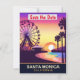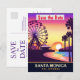 Invitation de mariage à Santa Monica avec date à retenir, carte postale de voyage. Beau coucher de soleil sur la côte et grande roue.