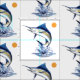 Une image de beau marlin de saut est décrite sur ce tissu coloré. Elle inspirera une variété sans fin de projets pour rappeler un des jours d'été heureux passés la plage ou les temps cabriolant dans les îles.