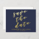NouvelleAlléeParc - Carte postale élégante, avec 'Sauvegardez la date' en typographie élégante de faux or à feuilles, sur un fond bleu marine. Facile à personnaliser dans Zazzle avec vos propres noms, date ou autre texte pour une conception personnalisée. Tous les styles de texte, couleurs et tailles peuvent être modifiés pour répondre à vos besoins. Vous pouvez également changer la couleur de fond en n'importe quelle couleur que vous préférez.