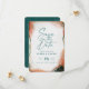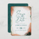 Aquarelle Ethérée Abstraite Vert foncé turquoise & Mariage en cuivre Enregistrer les cartes de date. Ce design mariage moderne est magnifiquement peint à la main avec des couleurs riches qui sont parfaites pour l'automne. Montré dans la couleur Turquoise foncé de la palette de couleurs de : Vert Peacock Turquoise foncé, Rouille de cuivre, Or Dusty, Amande Grove, et Beige Bisque. Avec des détails de feuille de parties scintillant métallique, et une police de script de signature magnifique avec des queues, la collection de mariage d'aquarelle éthéré est sûr de rendre votre mariage mémorable et belle! Pour en savoir plus, recherchez les collections mariages 2021 de Chic Paperie pour voir des designs plus tendance et des couleurs mariages pour cette année.