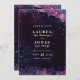 Enregistrez les cartes datées avec des traits abstraits de peinture à l'aquarelle violet, bleu et noir avec des points d'or et du texte simple et moderne. Ce chic et unique et sombre à l'exception des dates sont parfaits pour les mariages de musée d'art moderne et de galeries d'art !