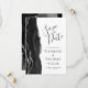 Le bord gauche de cet élégant mariage moderne, sauf la carte de date, est doté d'une bordure en aquarelle noire taillée avec une parties scintillant en faux argent. Le texte personnalisable combine écriture manuscrite grise au fusain, cuivre et polices italiques sur un arrière - plan blanc. L'envers présente un design d'agate noir et argent assorti.