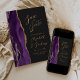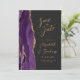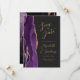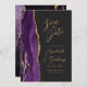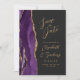 Le bord gauche de cet élégant mariage moderne, à l'exception de la carte de date, comporte une bordure d'aquarelle bleu violet ornée d'une fausse parties scintillant dorée. Le texte personnalisable combine écriture manuscrite couleur or, cuivre et polices italiques sur un arrière - plan non noir. L'envers est assorti d'une agate violette et dorée.