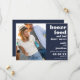 Invitez vos invités à réserver la date de votre mariage avec humour grâce à ce design amusant qui est entièrement personnalisable. Le texte est entièrement aligné à droite, avec une typographie blanche en gras, Booze Food suivi de And Bad Dance Moves, vos noms, date et lieu de mariage, sur un fond bleu marine. Personnalisez facilement le texte et téléchargez simplement votre photo préférée de vous deux pour remplacer l'exemple. Un fond assorti est prévu au dos que vous pouvez changer en une couleur différente si vous le souhaitez via l'option Personnaliser davantage.