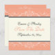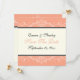 Annonce personnalisée de conservation de date de mariage corail et blanc avec une belle bordure ornementale corail et blanche avec des volutes sur fond ivoire.
