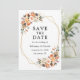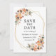 Moderne Elégant Aquarelle Floral Enregistrer La Carte Mariage Date Fiançailles comprend de belles fleurs d'automne sur un cadre géométrique doré. Roses oranges, roses de pêche, roses dorés, roses roses roses, succulents couleur prune, roses blanches, feuilles d'eucalyptus et autres plantes botaniques. Sage Green Back.