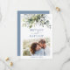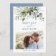Elégante Aquarelle moderne Botanique Verdure Fiançailles Mariage Enregistrer La Carte Date comprend des feuilles d'eucalyptus, vert feuillage botanique, feuilles bleus poussiéreux et d'autres belles verdure botanique. Photo Couple. Bleu Dusty Back.