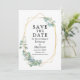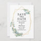 Elégante aquarelle moderne Eucalyptus Vert Mariage Fiançailles Enregistrer La Carte Date inclut des feuilles d'eucalyptus sur un cadre géométrique or.