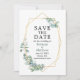Elégante aquarelle moderne Eucalyptus Vert Mariage Fiançailles Enregistrer La Carte Date inclut des feuilles d'eucalyptus sur un cadre géométrique or.
