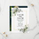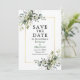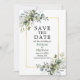 Elégant Aquarelle moderne Botanique Verdure Enregistrer La Carte Date comprend des feuilles d'eucalyptus, le feuillage botanique vert, des feuilles bleus poussiéreux et d'autres belles verdure botanique sur un cadre doré. Photo De Retour.