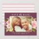 Mariage élégant sauf la date faire-part conception de la carte dispose d'une photo fiançailles horizontale encadrée par un joli arrangement floral aquarelle avec feuillage vert et rose pastel, rougit, pêche printemps et dahlia d'été et fleurs roses. Un motif aux rayures horizontales blanches habille le dos de la carte. Les couleurs bordeaux / vin rouge et ballet rose arrière - plan peuvent être customisées.