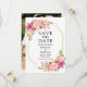 Elégante aquarelle rose Blush Floral Enregistrer la date Faire-part Mariage Carte inclut roses roses et verdure botanique sur un cadre géométrique or. Photo De Retour.