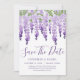 Aquarelle Wisteria Enregistrer la Date présente d'élégantes fleurs de glycine d'aquarelle en lavande douce et violet avec des feuilles verts sur un arrière - plan blanc avec vos informations Enregistrer la Date ci-dessous. Personnalisez en modifiant le texte dans les zones de texte. Conçu pour vous par Evco Studio www.zazzle.com/store/evcostudio