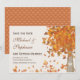 Personnalisez ces jolies cartes de save the date sur le thème de l'automne et les faire-parts de mariage avec la date de vos prochaines noces. Un bel arbre avec des feuilles en forme de cœur peut être personnalisé avec les initiales du marié et de la mariée sur le devant de ces faire-part. Fond de cœur orange. Œuvre © Chrissy H. Studios, LLC. Tous droits réservés.