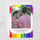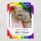 LGBTQ double face enregistrer la carte de date avec des traits de pinceau arc-en-ciel encadrant une photo du couple avec du texte noir. De l'autre côté, une autre photo et le site de votre mariage pour que vos invités puissent trouver plus d'informations en ligne sur votre prochain mariage.