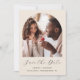 Cette simple et minimaliste carte Save the Date présente une arche photo boho au-dessus des mots "Save the Date" dans un élégant script d'écriture manuscrite en noir, suivi des noms du couple, date mariage et ville en sans serif police sur un arrière - plan beige. Ajoutez un message plus détaillé avec des informations supplémentaires sur l'inverse.