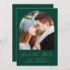 Cette simple et minimaliste carte Save the Date présente une arche photo boho au-dessus des mots "Save the Date" dans un élégant script d'écriture dorée, suivi des noms du couple, date mariage et ville en sans serif police sur un arrière - plan vert émeraude. Ajoutez un message plus détaillé avec des informations supplémentaires sur l'inverse.