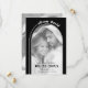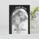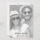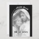 Cette carte Save the Date présente un design moderne et minimaliste, avec des couleurs noir et blanc. Il présente une arche moderne encadrant une photo défraîchie du couple, ajoutant une touche élégante. Les noms du couple sont écrits dans une police courbe stylisée en haut, suivant la courbe d'une ligne qui s'étend à droite. La couleur autour de l'arc est noire. Le dos de la carte contient une autre photo et le site du mariage du couple.