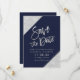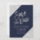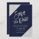 La typographie argentée sur le bloc de couleur marine bleu argent personnalisable parties scintillant, et les bandes géométriques faux argent chic enregistrer le mariage date, parfait pour élégant, élégant mariage,