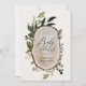 Invitation de baby shower en tranches de bois rustique. Avec un beau feuillage aquarelle, des fleurs blanches, une tranche de bois et une écriture manuscrite. Cet invitation de fête moderne est sûr de définir le style de votre prochaine fête.