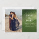 Ce magnifique mariage, sauf la carte datant, présente un design de feuille de bananier et un modèle photo à gauche. Un autre modèle photo est inclus à l'arrière, ainsi que des modèles de texte à l'avant et à l'arrière pour une personnalisation simple. Parfait pour une destination tropicale ou un mariage à thème de plage !
