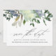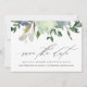 Ce magnifique Mariage Save the Date présente de belles fleurs d'aquarelle bleu et blanc poussiéreuses, une végétation luxuriante et une calligraphie élégante.