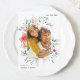 Ce joli mariage sauve la date faire-part présente des fleurs colorées d'aquarelle et délicate pêche douce, blanc ivoire, et des fleurs roses, avec des feuilles verts subtils sur un arrière - plan blanc qui ajoutent une douce beauté à ce design romantique. Une belle photo en forme d'arc se trouve au milieu de la carte. Magasinez ce magasin pour coordonner les invitations de mariage.