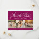 Style vintage personnalisé framboise / baie rouge et blanc (note, la couleur arrière - plan peut être modifiée) mariage enregistrer la fonction de cartes de date "Enregistrer la date" dans un élégant style de script de calligraphie manuscrite, trois (3) espaces pour les photos fiançailles (conseil : rogner à la forme carré avant de télécharger), et du texte sur le dos qui peut être personnalisé avec des informations mariage.