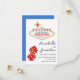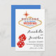 Cette invitation de mariage personnalisée avec save the date présente un thème de casino de Las Vegas. Le classique panneau Bienvenue à Las Vegas est imprimé en haut avec un exemple de texte que vous pouvez personnaliser. Une paire de dés scintillants rouges est imprimée en bas, Les noms des mariés et la date du mariage sont imprimés à droite des dés dans une élégante police noire.