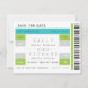 Customisez ce billet amusant et annoncez votre date de mariage de manière audacieuse et unique ! Tons de Kelly Green et Aqua Blue avec des accents de Black. Un mélange de polices numériques pour une sensation de ticket de concert.