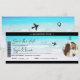 Un élégant billet de mariage de carte d'embarquement monogrammé, un portrait du couple fiancé, un avion avec une traînée de boucle et un modèle de sauvegarde de date facile à personnaliser. N'oubliez pas de modifier le texte au dos du monogramme.