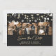 Elégante photo personnalisée en noir et or mariage enregistrer les cartes de date avec une police de script moderne. Notre mariage, sauf la date, présente un montage photo de 4 images contre un arrière - plan noir orné de lampes à cordes. Personnalisez facilement ce noir et or enregistrer la carte de date avec vos images et les détails du mariage, y compris un site Web mariage, si désiré. Pour des demandes personnalisées, envoyez-nous un message.