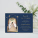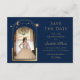 Bleu céleste Enregistrer la date Anniversaire Quinceanera Invitation présente un cadre de soleil doré, de lune et d'étoiles sur un arrière - plan bleu. À l'intérieur est votre photo préférée et votre Quinceanera personnalisée enregistrer les informations de date. Personnalisez en modifiant le texte dans les zones de texte et en ajoutant votre photo préférée. Conçu pour vous par ©2024 Evco Studio www.zazzle.com/store/evcostudio