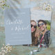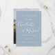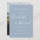 Doté de noms de style signature, cet élégant bleu poussiéreux enregistrer la carte de date peut être personnalisé avec vos informations spéciales de mariage dans la typographie chic et votre photo spéciale au verso. Conçu par Thisisnotme©