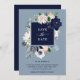 Cette carte de mariage élégante pour annoncer la date de votre mariage présente un cadre de fleurs aquarelles bleu marine, bleu clair et rose blush avec des feuilles vertes et beige neutre. Le dos de la carte est bleu marine foncé.