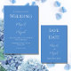 Bleu barbeau « Save the Date » qui est parfait comme prélude à votre invitation officielle pour tous vos invités. Fait avec de belles polices en blanc simple et pourtant élégant. Parfait pour votre occasion spéciale. Un rappel parfait pour tous vos invités.