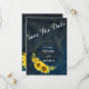 Une élégante invitation de mariage avec un cadre doré de tournesols joyeux sur fond texturé bleu nuit.