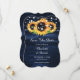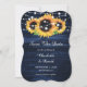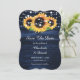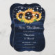 Mariage rustique bleu marine et tournesol enregistrer les cartes de date avec tournesol sur un arrière - plan en bois orné de lampes à cordes. Deux coeurs de burlap à l'arrière. Éléments correspondants disponibles.