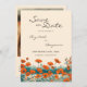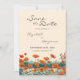 Cette belle Boho Bohemian Photo enregistrer la carte de date, dispose d'un dessin à l'encre de fleurs sauvages de pavots aux couleurs chaudes rustiques, orange et turquoise, inspirée de la technique d'art japonais traditionnel ukiyo-e ou des estampes en bois japonais. Personnalisez cette belle Save the date card with your own text, photo and QR code.