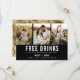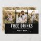 Mariage amusant, enregistrez les cartes de date dans un design moderne en trois photos noir qui dit "Boissons gratuites et nous nous marions". Customisez le devant de la carte avec 3 photos fiançailles et détails mariages. Vous pouvez également ajouter une photo horizontale à l'arrière.